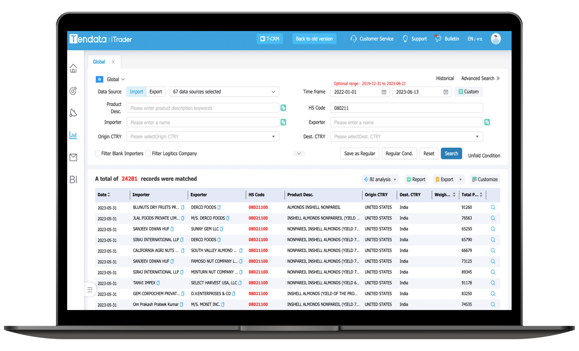T-info ofrece datos directos de importación y exportación de 65 países y 4 regiones, y datos cruzados de importación y exportación de más de 220 países. La búsqueda se puede realizar con único criterio o múltiples criterios. Nos permite analizar rápidamente estos datos con 20 opciones diferentes de “İnformes İnteligentes”. De esta manera, puede acceder a información como información de la empresa compradora-vendedora, descripciones de productos, volúmenes de envío, puertos de origen-llegada, etc. en los países de destino.